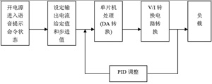 在工作過程中,SPCE061A單片機將被預置的電流值通過換算進行D/A轉換,以輸出電壓驅動V/I轉換電路實現電路輸出,並將該電流值對應的電壓值通過閉環回路,經A/D轉換後輸入單片機係統,再通過PID算法調整電流輸出。整個係統工作流程圖如圖4所示。