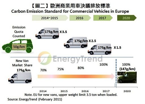 歐洲國會發布最新的商用車車輛排放標準決議,針對在載重能力為3.5噸的車輛,未來車廠所生產的車輛中,70%的數量須符合175g/km的排放標準,而2017年平均比例更須達到100%。無法達到要求的汽車製造商,2019年開始將被要求繳交每單位金額$129/g的增額排放罰款。另外,生產排放低於50g/km的車輛,也將能夠回饋車廠在高排放車種的緩衝額度。