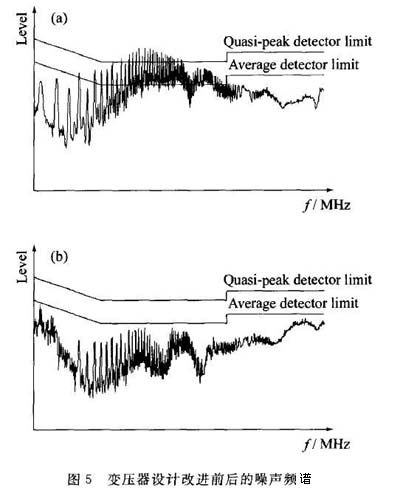 圖5為變壓器設計改進前後實驗樣品的傳導噪聲頻譜對比。