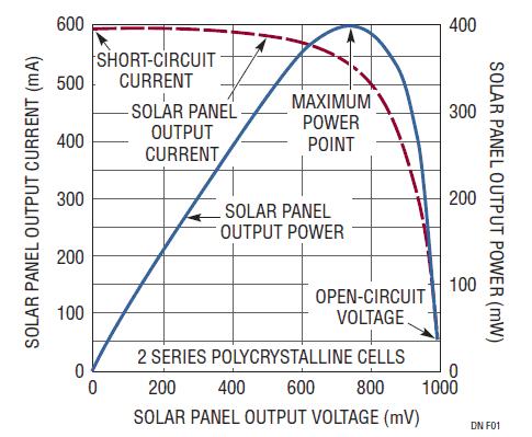 雖然太陽能電池或太陽能電池板是按照功率輸出來分類,但電池板的可用功率卻很少是恒定的。其輸出功率在很大程度上取決於光照、溫度以及從電池板吸收的負載電流。為說明這一點,圖 1 示出了一塊雙電池太陽能板在恒定光照條件下的 V-I 特性曲線。I-V 曲線在短路 (最左側) 至大約 550mA 負載電流的範圍內具有相對恒定的電流特性,隨之在較低的電流條件下它遵從於恒定電壓特性,並在開路時 (最右側) 趨近於最大電壓。電池板的功率輸出曲線顯示:功率輸出在大約 750mV/530mA 的地方 (I-V 曲線的拐點處) 出現一個明顯的峰值。如果負載電流增至超過功率峰值,則功率曲線迅速下降至零 (最左側)。同樣,輕負載也會使功率趨向於零 (最右側),不過這往往不太會是一個問題。