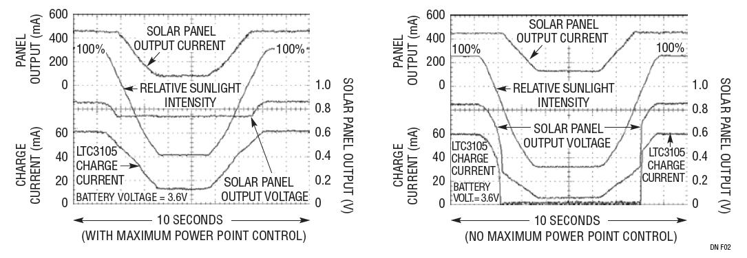 圖 2 示出了在采用和未采用最大功率點控製的情況下,陽光的變化對於充電電流的影響。模擬陽光的強度從 100% 降至約 20%,而後回升至 100%。請注意,當陽光強度下降至 20% 左右時,太陽能板的輸出電壓和電流也下降,但是 LTC®3105 的最大功率點控製則可以防止太陽能板的輸出電壓降至 750mV 的設定值以下。它通過減小 LTC3105 的輸出充電電流以防止太陽能板電壓驟降至接近 0V 來實現上述功能,如圖 2 中右側的曲線圖所示。而在未采用功率點控製時,陽光強度的小幅下降也會完全阻斷充電電流的流動。