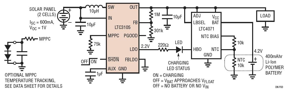 圖 3 示出了一款緊湊的太陽能供電型電池充電器,它采用 LTC3105 作為升壓型轉換器,而將 LTC4071 用作鋰離子電池並聯充電器。一塊雙電池 400mW 太陽能板負責為 LTC3105 提供輸入功率,以在陽光充足的情況下產生 60mA 以上的充電電流。如圖 1 所示,最大功率點控製可防止太陽能板的電壓降至 750mV 的最大功率點以下。轉換器的輸出電壓被設置為 4.35V,略高於鋰離子電池的 4.2V 浮置電壓。LTC4071 並聯充電器將電池兩端的電壓限製為 4.2V。把 FBLDO 引腳接地可將低壓差穩壓器設置為 2.2V,用於給“充電”LED 供電。該 LED 在電池充電時接通,而當電池電壓處於浮置電壓的 40mV 以內時則關閉 (以表示電池接近滿充電狀態)。一個 NTC 熱敏電阻用於感測電池溫度,並在環境溫度很高的情況下降低 LTC4701 的浮置電壓以提高電池的安全性。為避免電池遭受過度放電的損壞,低電池電量斷接功能可在電池電壓下降至低於 2.7V 時將電池與負載斷接。