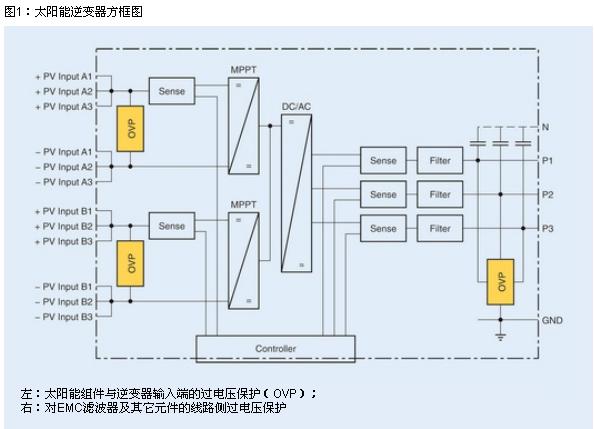 太陽能裝置通常裝在屋頂等戶外位置,也越來越多地裝在開闊地帶,因而過電壓帶來的風險極高,而太陽能組件與逆變器(直流電平)之間長長的引線以及接至電網(交流電平)的饋線則又加劇了這一風險。圖1為典型太陽能逆變器的結構:將來自太陽能組件的直流電壓轉換成交流電壓,然後供給電網。