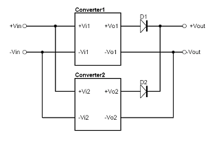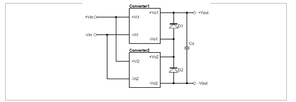 圖3-2為使用Decoupling Diode方式的輸出並聯應用方式,其方式為在二組電源模塊的輸出端,分別串接上二極管,再並聯使用。