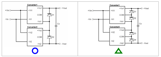 圖2-2為兩個雙路輸出電源模塊串聯接線方式,因此,可得到四組Vout相加後的輸出電壓。單一個雙路輸出電源模塊,其兩組輸出之啟動時間是一致的,故僅需在+/-Vo1及+/-Vo2各並上二極管即可,如圖左所示。在上圖中,輸出端共並上4顆二極管,此方式亦可行,但較浪費成本。串聯後的輸出電壓,可再加上輸出電容,用以降低因兩電源模塊差頻所造成的Ripple & Noise。