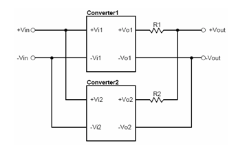 在兩組電源模塊的輸出端,分別串接Drop電阻,再並聯使用,如圖3-1所示。此種方式主要利用輸出電流對R1及R2形成的線性電壓降,使得兩組電源模塊會盡量達到平衡供應負載的目的,避免輸出電壓較高的電源模塊來提供大部份的負載需求。