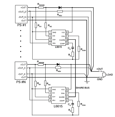 如圖3-3,為使用Current share專用IC進行並聯使用,在此種方式,每一個電源模塊本身需具備有Remote sense或Trim的(de)功(gong)能(neng),方(fang)可(ke)進(jin)行(xing)均(jun)流(liu)控(kong)製(zhi)。此(ci)種(zhong)方(fang)式(shi)的(de)每(mei)一(yi)個(ge)電(dian)源(yuan)模(mo)塊(kuai)都(dou)可(ke)以(yi)均(jun)流(liu)輸(shu)出(chu),對(dui)電(dian)源(yuan)模(mo)塊(kuai)的(de)壽(shou)命(ming)有(you)幫(bang)助(zhu),但(dan)成(cheng)本(ben)相(xiang)對(dui)較(jiao)高(gao),適(shi)合(he)應(ying)用(yong)於(yu)有(you)較(jiao)高(gao)精(jing)確(que)度(du)要(yao)求(qiu)的(de)應(ying)用(yong)場(chang)合(he)。