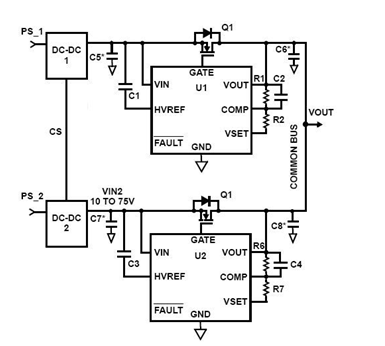 在(zai)兩(liang)組(zu)或(huo)多(duo)組(zu)電(dian)源(yuan)模(mo)塊(kuai)輸(shu)出(chu)回(hui)路(lu)中(zhong),各(ge)串(chuan)接(jie)二(er)極(ji)管(guan)後(hou)並(bing)聯(lian)連(lian)接(jie),使(shi)得(de)當(dang)單(dan)一(yi)模(mo)塊(kuai)產(chan)生(sheng)異(yi)常(chang)時(shi),其(qi)它(ta)模(mo)塊(kuai)可(ke)接(jie)續(xu)提(ti)供(gong)電(dian)源(yuan),維(wei)持(chi)係(xi)統(tong)工(gong)常(chang)運(yun)作(zuo)。其(qi)中(zhong)二(er)極(ji)管(guan)應(ying)選(xuan)擇(ze)低(di)順(shun)向(xiang)導(dao)通(tong)電(dian)壓(ya)降(jiang)(Low Vf),以降低導通損失。