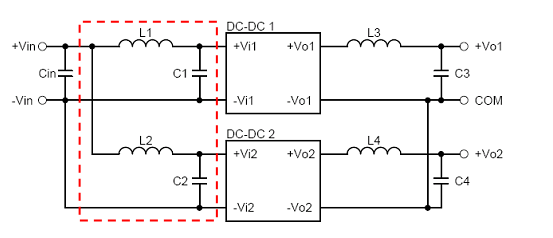 在(zai)一(yi)電(dian)源(yuan)係(xi)統(tong)中(zhong),若(ruo)同(tong)時(shi)使(shi)用(yong)多(duo)組(zu)電(dian)源(yuan)模(mo)塊(kuai),且(qie)輸(shu)入(ru)端(duan)使(shi)用(yong)同(tong)一(yi)電(dian)源(yuan)時(shi),為(wei)防(fang)止(zhi)二(er)組(zu)或(huo)多(duo)組(zu)電(dian)源(yuan)模(mo)塊(kuai)之(zhi)間(jian)的(de)交(jiao)互(hu)幹(gan)擾(rao),形(xing)成(cheng)係(xi)統(tong)所(suo)不(bu)樂(le)見(jian)的(de)EMI問題,甚至造成係統誤動作的諧波,此時,可在電源係統前端與EMI filter之間加入L1、C1、L2與C2來減低電源模塊之間的交互幹擾。