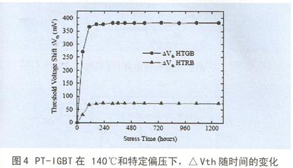 。圖4給出PT—IGBT(IRG4BC20F)在(1)柵已射極Gge=20V,Vce=OV(HTGB)和(2)Vge=0V,Vce=0.8V(HTRB)在140℃,經過1200小時的應力試驗結果。由圖4中的HTGB曲線可見,柵偏置試驗開始後100小時內,