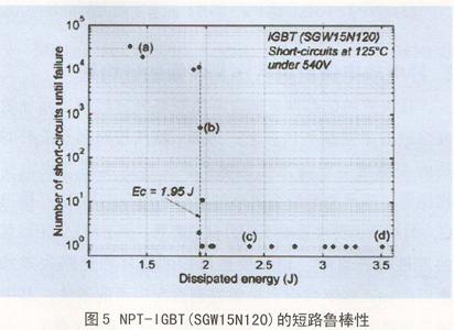 NPT—IGBT的魯棒性見圖5,被測器件是SGW15N120。在540V 125℃時測試。X軸是耗散的能量。Y軸是器件直至損壞的短路周期次數。