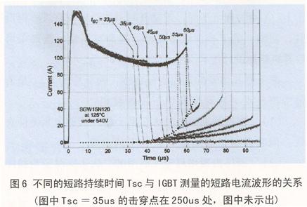 圖6給出不同短路續時間TSC,IGBT測量的短路電流波形。