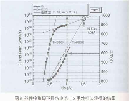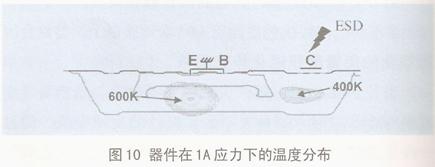 圖10是1A電流應力下,模擬顯示該器件有兩個熱點。一個在收集極觸點下,損傷電流IT2=1.52A;另一個熱點在發射極之下,用外推法算出的損傷電流遠大於2A。所以,首先出現導致失效的矽熔融點應在收集極。