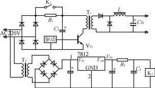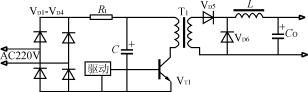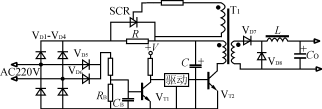 該電路如圖3所示。在電源瞬時接通時,輸入電壓經整流橋VD1VD4和限流電阻R對電容器C充電。當電容器C充電到約80%的額定電壓時,逆變器正常工作,經主變壓器輔助繞組產生晶閘管的觸發信號,使晶閘管導通並短路限流電阻R,開關電源處於正常運行狀態。