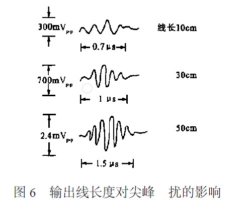 為減小輸出線上的損耗和尖峰幹擾,輸出到負載的連線應短。圖6畫出了對三種不同長度的輸出線,當負載電流為8A時,在負載端所測得的幹擾波形。輸出線長,尖峰幹擾的幅度大、寬度也寬。相同長度的輸出線,線徑粗則尖峰幹擾幅度大、寬度寬。用雙絞線能有效地衰減電磁感應電勢,表1說明對感應電勢衰減的數值隨扭距變短而增大。