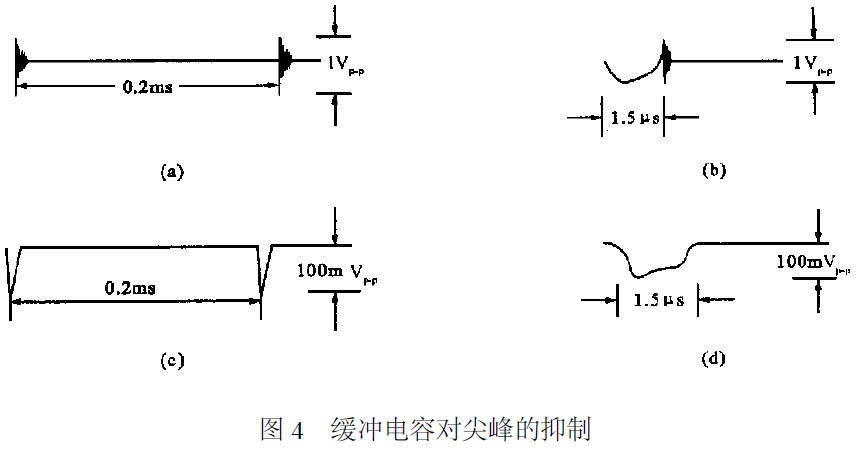在開關三極管的CE之間,或者在續流二極管的兩端並聯RC緩衝電路可使尖峰幹擾明顯減小。圖3中,三極管T關斷時,集電極電壓上升,通過D和R1對C充電,使其上升速率變緩,選擇充電常數CR1的值可以控製上升速率。T導通時,D截止,C對R1和R2放電,限製了導通瞬間的峰值電流。該緩衝電路改變了負載線的形狀,減少了開關三極管的損耗。在續流二極管兩端並上RC電路也同樣有效。圖3中,當用3DD11和2CK120C時,可並0.022LF左右的電容器(f=2kHz),該電容的容量有一最佳值,它的作用可以從圖4看出。圖4(a)是不加C的情況,將其在時間軸上放大後為圖4(b)。並上緩衝電容後分別見圖4(c)和(d)。