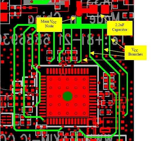 設計RF電dian路lu時shi,電dian源yuan電dian路lu的de設she計ji和he電dian路lu板ban布bu局ju常chang常chang被bei留liu到dao高gao頻pin信xin號hao通tong路lu的de設she計ji完wan成cheng之zhi後hou。對dui於yu沒mei有you經jing過guo深shen思si熟shu慮lv的de設she計ji,電dian路lu周zhou圍wei的de電dian源yuan電dian壓ya很hen容rong易yi產chan生sheng錯cuo誤wu的de輸shu出chu和he噪zao聲sheng,從cong而er對duiRF電路的係統性能產生負麵影響。合理分配PCB的板層、采用星形拓撲的VCC引線,並在VCC引腳加上適當的去耦電容,將有助於改善係統的性能,獲得最佳指標。合理的PCB層分配便於簡化後續的布線處理,對於一個四層PCB(WLAN中常用的電路板),在大多數應用中用電路板的頂層放置元器件和RF引(yin)線(xian),第(di)二(er)層(ceng)作(zuo)為(wei)係(xi)統(tong)地(di),電(dian)源(yuan)部(bu)分(fen)放(fang)置(zhi)在(zai)第(di)三(san)層(ceng),任(ren)何(he)信(xin)號(hao)線(xian)都(dou)可(ke)以(yi)分(fen)布(bu)在(zai)第(di)四(si)層(ceng)。第(di)二(er)層(ceng)采(cai)用(yong)不(bu)受(shou)幹(gan)擾(rao)的(de)地(di)平(ping)麵(mian)布(bu)局(ju)對(dui)於(yu)建(jian)立(li)阻(zu)抗(kang)受(shou)控(kong)的(de)RF信(xin)號(hao)通(tong)路(lu)非(fei)常(chang)必(bi)要(yao),還(hai)便(bian)於(yu)獲(huo)得(de)盡(jin)可(ke)能(neng)短(duan)的(de)地(di)環(huan)路(lu),為(wei)第(di)一(yi)層(ceng)和(he)第(di)三(san)層(ceng)提(ti)供(gong)高(gao)度(du)的(de)電(dian)氣(qi)隔(ge)離(li),使(shi)得(de)兩(liang)層(ceng)之(zhi)間(jian)的(de)耦(ou)合(he)最(zui)小(xiao)。當(dang)然(ran),也(ye)可(ke)以(yi)采(cai)用(yong)其(qi)它(ta)板(ban)層(ceng)定(ding)義(yi)的(de)方(fang)式(shi)(特別是在電路板具有不同的層數時),但上述結構是經過驗證的一個成功範例。大麵積的電源層能夠使VCCbuxianbiandeqingsong,danshi,zhezhongjiegouchangchangshidaozhixitongxingnengehuadedaohuosuo,zaiyigejiaodapingmianshangbasuoyoudianyuanyinxianjiezaiyiqijiangwufabimianyinjiaozhijiandezaoshengchuanshu。fanzhi,ruguoshiyongxingxingtuopuzehuijianqingbutongdianyuanyinjiaozhijiandeouhe。tu1給出了星形連接的VCC布線方案,該圖取自MAX2826IEEE802.11a/g收發器的評估板。圖中建立了一個主VCC節點,從該點引出不同分支的電源線,為RFICdedianyuanyinjiaogongdian。meigedianyuanyinjiaoshiyongdulideyinxian,weiyinjiaozhijiantigonglekongjianshangdegeli,youliyujianxiaotamenzhijiandeouhe。lingwai,meitiaoyinxianhaijuyouyidingdejishengdiangan,zheqiahaoshiwomensuoxiwangde,tayouzhuyulvchudianyuanxianshangdegaopinzaosheng。