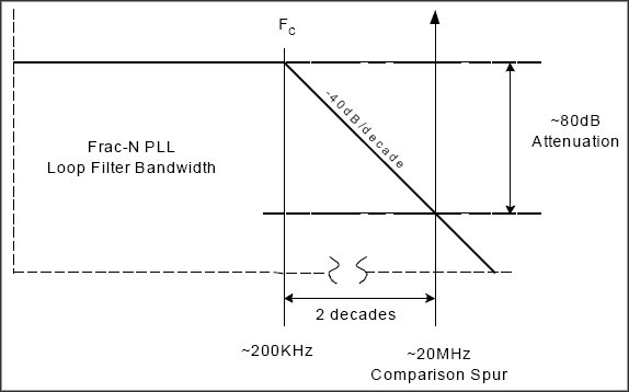 上述討論提出了另外一個問題,即如何有效地將PLL雜散成分限製在一定的範圍內,使其不對發射頻譜產生影響。一旦發現了雜散成分,首先想到的方案就是將PLL環路濾波器的帶寬變窄,以便衰減雜散信號的幅度。這種方法在極少數的情況下是有效的,但它存在一些潛在問題。圖8給出了一種假設情況,假設設計中采用了一個具有20MHz相對頻率的N分頻合成器,如果環路濾波器是二階的,截止頻率為200kHz,滾降速率通常為40dB/十倍頻程,在20MHz頻點可以獲得80dB的衰減。如果參考雜散成分為-40dBc(假設可以導致有害的調製分量的電平),產生雜散的機製可能超出環路濾波器的作用範圍(如果它是在濾波器之前產生的,其幅度可能非常大)。壓縮環路濾波器的帶寬將不會改善雜散特性,反而提高了PLL鎖相時間,對係統產生明顯的負麵影響。