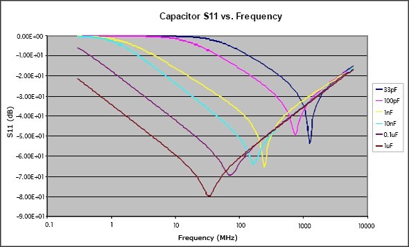 之後,電容的阻抗將呈現出電感性。由此可見,電容器隻是在頻率接近或低於其SRF時才具有去耦作用,在這些頻點電容表現為低阻。圖3給出了不同容值下的典型S11參數,從這些曲線可以清楚地看出它們的SRF,還可以看出電容越大,在較低頻率處所提供的去耦性能越好(所呈現的阻抗越低)。