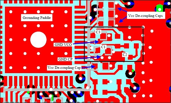 濾除其它電路的噪聲、抑製本地產生的噪聲,從而消除級與級之間通過電源線的交叉幹擾,這是VCC去耦帶來的好處。如果去耦電容使用了同一接地過孔,由於過孔與地之間的電感效應,這些連接點的過孔將會承載來自兩個電源的全部RF幹擾,不僅喪失了去耦電容的功能,而且還為係統中的級間噪聲耦合提供了另外一條通路。在本文第三部分的討論中將會看到,PLL的實現在係統設計中總是麵臨巨大挑戰,要想獲得滿意的雜散特性必須有良好的地線布局。