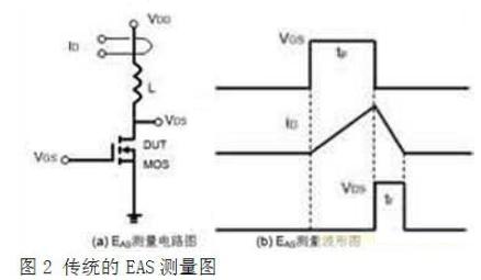 過去,傳統的測量EAS的電路圖和波形如圖2所示。注意到,VDS最後的電壓沒有降到0,而是VDD,也就是有部分的能量沒有轉換到雪崩能量中。