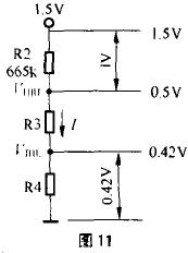 溫度傳感器采用NTC熱敏電阻RT,已知RT在0℃時阻值為333.1kΩ;5℃時阻值為258.3kΩ,則按1.5V工作電壓及流過R1、RT的電流約1.5 uA,可求出R1的值。R1的值確定後,可計算出0℃時的VA值為0.5V(按圖10中R1=665kΩ時),5℃時的VA值為0.42V,則VTHL=0.42V,VTHH=0.5V。若設R2=665kΩ,則按圖11,可求出流過R2、R3、R4電阻的電流I=(1.5V-0.5V)/665kΩ=0.0015mA,按R4×I/=0.42V,可求出R4=280kΩ再按0.5V=(R3+R4)0.0015mA, 則可求出R3=53.3kΩ。