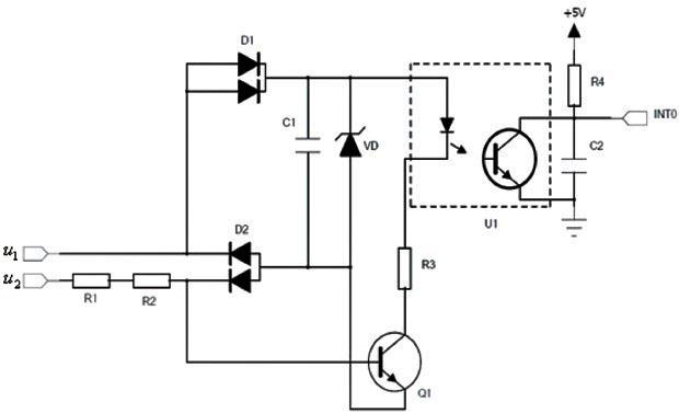 當u 1 >u 2 時,穩壓管兩端電壓為5V,電容C1充電,由於C1容值較小。而u 1>u 2 的時間為半個周期,即0.01s,足以保證電容C1充電完成,此時並聯在三極管Q1基射極兩端的的二極管提供鉗位電壓,使得三極管工作在截止區,光耦U1的控製二極管不導通,受控三極管截止,單片機外部INT0拉至高電平,當經過a點後,u 2>u 1 ,U2為三極管Q1提供基極電壓,同時電容C1提供集射極電壓,三極管Q1導通,在這段時間內,C1、控製二極管、R3、Q1形成回路,光耦U1中的受控三極管導通,單片機外部中斷INT0下拉至低電平,在這個過程中,單片機對這個下降沿進行捕捉,實現對u1、u2兩相交點a進行檢測,光耦U1實現了輸入端和輸出端的電氣隔離,同時提高了係統的抗幹擾能力。