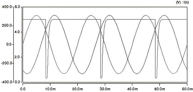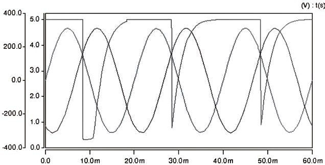 以上設計方案在Sabe r環境下進行了仿真驗證,仿真結果如圖5所示,其中兩正弦波為三相電源的其中兩相電壓,脈衝電壓為送至單片機外部中斷INT0的信號。從圖5可以清晰的看到,在自然換相點附近,產生了一組幅值為5V,脈寬約為2ms,頻率為50Hz的脈衝信號,而在自然換相點處,產生了一個近乎90度的下降沿,有利於單片機進行捕捉。改變時間常數τ可以改變脈衝電壓的脈寬,如圖5所示,在自然換相點處產生了一組幅值為5V,脈寬約為10mS,頻率為50Hz的脈衝信號。 圖5 為經檢測電路得到的脈衝電壓,圖6為不同τ值檢測電路得到的脈衝電壓。