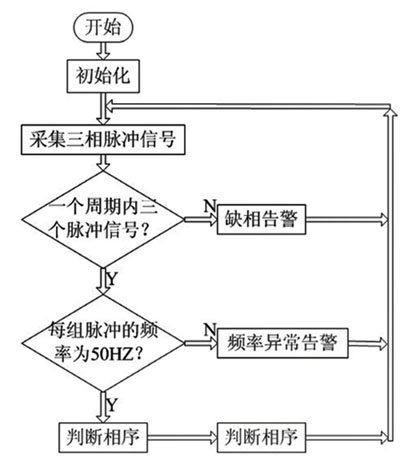 檢測電路得到的脈衝電壓信號送至Atmega16單片機進行處理,單片機的程序通過C 語言編製, 主程序流程如圖7 所示, 主要分為三個模塊: 缺相判定, 頻率正常判定和相序判定, 係統正常工作後,三個模塊循環執行。
