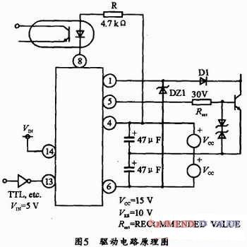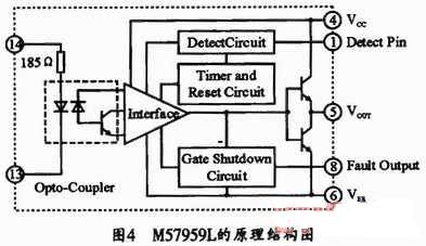 M57959L是日本三菱公司生產的混合集成IGBT驅動器,其內部原理結構如圖4所示。它由高速光電隔離輸入,絕緣強度高,可與TTLdianpingjianrong。neizangdingshiluojiduanlubaohudianlu,bingjuyoubaohuyanshitexing。xinpianyouzhengfudianyuangongdian,kefuledandianyuangongdianshifudianyabuwendequedian,qudonggonglvda,kequdong200A/600V或100A/1200V的IGBT模塊。由M57959L構成的驅動電路如圖5所示。