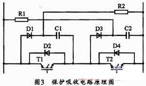 由於電路中分布電感的存在,加之IGBT開關速度較高,當IGBT關斷時及與之並接的反向恢複二極管逆相恢複時,會產生很大的浪湧電壓Ldi/dt,從而威脅IGBT的安全。因此必須采取措施抑製浪湧電壓,保護IGBT不被損壞。可以采用加裝保護吸收電路的辦法來抑製浪湧電壓。其原理圖如圖3所示,該保護吸收電路有良好的抑製效果,具有保護吸收中發生損耗小的優點。