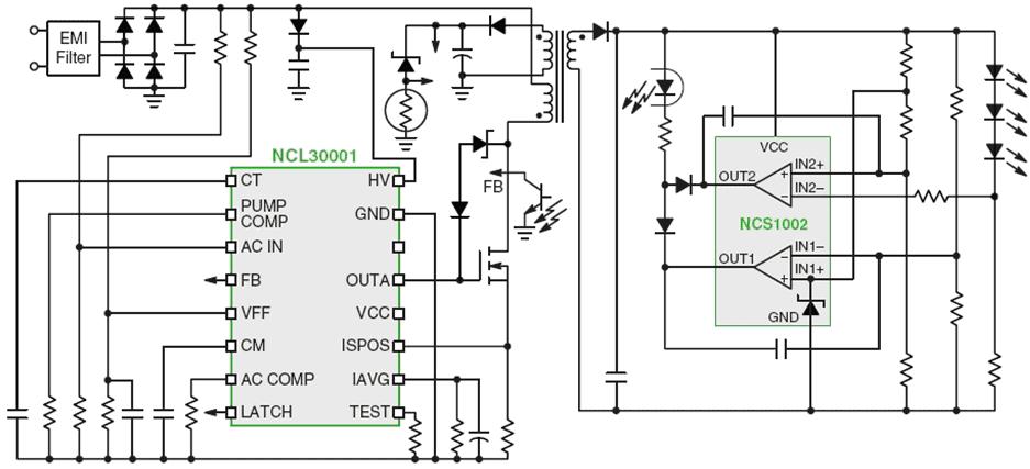 圖4:基於NCL30001 LED驅動器和NCS1002控製器的90 W LED驅動器演示板電路。