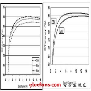 Maxim電源部製作了一款基於MAX5051的隔離電源模塊,圖2是詳細的電氣原理圖。我們將該電源模塊與市場上流行的電流模式同步整流推挽電源模塊(這裏我們稱其為非定製模塊)進行了比較,從所測試的效率曲線(圖3)可以看出,基於MAX5051的模塊效率明顯提高。輕載時,比如1A輸出負載,MAX5051模塊電源的效率大於62%,而非定製模塊的效率則小於58%。在輸出功率為半載時(7.5A),MAX5051模塊效率為92%,非定製模塊效率是88%。滿功率負載時,MAX5051模塊電源的效率仍比非定製模塊效率高出4%。從效率曲線對比,可以得出雙管正激電路能夠更好的滿足模塊電源高效率的要求。