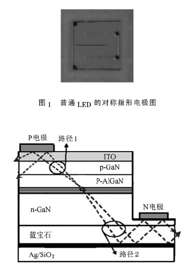 圖2 模擬了光在ODR LED 內部發射時所經過的路徑: 當在p,n 電極上加上正向壓降時,p 區空穴與n 區電子向有源區運動並發生輻射複合,發出的光線有兩條路徑,一條直接射出如圖2 中路徑1,另一條射向襯底下的全方位反射鏡,並發生反射,從頂麵或側麵射出如圖2 中路徑2,從而增加光射出的路徑,增強LED的光通量與光效.
