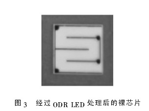 本批實驗樣品采用揚州華夏集成光電有限公司生產的芯片.對一塊外延片整體進行測試,發現測試結果基本一致後試製成芯片. 將該外延片一半製做成普通LED 芯片,另一半製做ODR LED 芯片,芯片的尺寸為40 mil. 選取一個單元中的ODR LED芯片如圖3 所示,與圖2 比較,可以明顯看出芯片亮度不同.