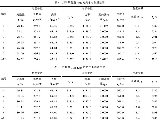 對封裝後的樣品選取普通LED 和ODR LED 各7個,兩類LED中不同樣品各自編號,先進行LED的快速光色電測試,測試儀器為杭州遠方HAAS- 2000 LED 快速光色電綜合測試量係統,測試溫度為25℃,測試電流為350 mA,兩組LED 的測試結果如下,表3 中去除5 號、表4 中去除5 號和7 號等性能不佳的樣品,兩組樣品測量反向漏電流時的反向電壓均為- 5. 008 V.