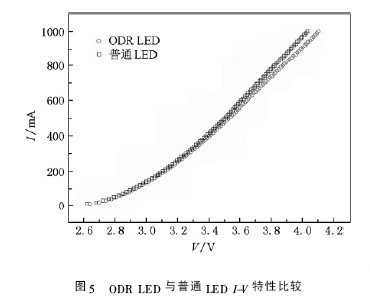 對ODR LED 與普通LED進行I-V 特性測試,測試條件為: 電流從0-1000 mA,間隔2mA,測試溫度為25℃,測試結果如圖5,從圖上可以看出,兩種LED 的整體電流電壓特性很好,均未出現隨著電流增大電壓出現飽和的情況,說明這批樣品品質較好. 當電流小於400 mA 時,ODR LED 與普通LED 的電流電壓曲線基本重合; 當電流大於400 mA 時, ODR LED 的電壓比普通LED 的電壓較高,並且差距越來越大,但始終在誤差範圍內. ODR LED 的串聯電阻為1. 160 Ω,比普通LED的串聯電阻1. 102 Ω僅增加0. 058 Ω,兩者基本相同.