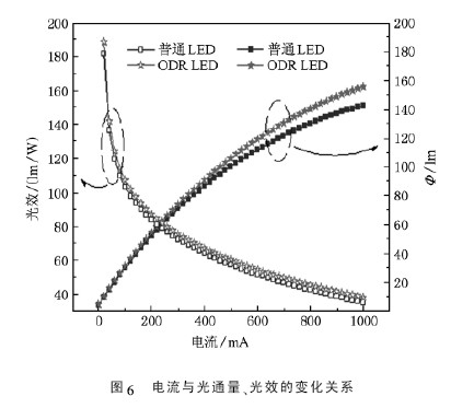 對兩種LED 的光通量和光效隨電流變化進行測量,測量條件與I-V 特性測試相同. 結果如圖6 所示,從圖中明顯看出,兩種LED 的光通量隨著電流升高而逐漸升高,光效均隨著電流的升高而逐漸降低; 而ODR LED 的光通量和光效要始終高於普通LED,這從光通量和光效隨電流變化的角度來證實了ODR LED 的優勢.