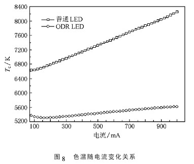 LED 的色溫是把標準黑體加熱溫度升高到一定程度時該黑體顏色開始深紅-淺紅-橙黃- 白-藍逐漸變化,當某光源與黑體顏色相同時,把黑體當時的絕對溫度稱為該光源的色溫. 從圖8 中可以看出,隨著電流的增加,兩種LED 的色溫均呈現增加的趨勢,這是由於電流加大後,兩種LED 的藍光發射強度均增加,而熒光粉的厚度是一定的,則在出射的白光中藍光成份增多,色溫增加. 普 通LED 的色溫偏高,從開始的6632 K 增加至8251 K,色溫始終處於高色溫段,且色溫變化較大; ODR LED 的色溫適中,從5308 K 升高至5619 K,色溫始 終處於中色溫段,且色溫變化幅度要遠小於普通LED 燈,說明ODR LED 在色溫方麵有著絕對的優勢---穩定性高.