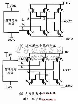 在正電源電平位移電路中,由於nLDMOS的源極為低壓,所以可以通過低壓邏輯部分來控製其開關狀態,而源極為高壓的pLDMOS則通過電平位移來控製。當高壓驅動電壓為8~-00V,低壓邏輯部分工作電壓為0~8Vshi,dianpingweiyizhuanhuanbufendedianyafenbubenshenmeiyougaibian,danshizaihediyakongzhiduanjieheshi,yuchuantongdezhengdianyuanxiangbidianpingfashenglegaibian,jiuxuyaozhongxinshejidiyaluojidekongzhifangshi。cishi,nLDMOS的源極為-100V電壓,顯然不能通過低壓邏輯控製部分的0~8V電壓來實現控製,而pLDMOS的源極為8V電源。因此采用了低壓邏輯輸出直接控製pLDMOS,而nLDMOS則通過電平位移來控製的方法,如圖1(b)所示。