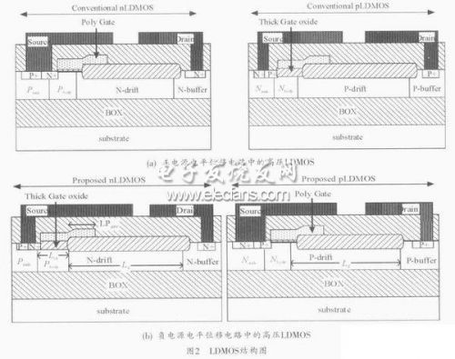 由於負電源供電的電平位移電路結構的改變,應用於正電源的常規nLDMOS和pLDMOS不能滿足該電路結構要求。在正電源供電的電平位移電路中,由於pLDMOS的源端接高壓電源,其柵源需要承受高壓,所以pLDMOS采用了厚柵氧的結構,如圖2(a)所示。在使用負電源的電平位移電路結構中(圖1(b)),pLDMOS的源端為邏輯高壓8V,柵端由低壓邏輯0~8V電壓控製,因此柵源不再承受高壓。但是nLDMOS的源端為負電源的最低電位,其柵源需要承受高壓,因此高壓nLDMOS需要采用厚柵氧結構,如圖2(b)所示。