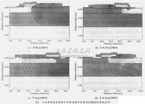 電源的改變不僅僅改變了電路的結構,nLDMOS的厚柵氧,同時器件的耐壓機理也發生了改變。考慮到低壓管的背柵效應,SOI材料的襯底隻能接地,因此源漏電平的改變將引起nLDMOS和pLDMOS耐壓機理的改變。圖3是利用工藝(Tsuprem4)、器件(Medici)聯合仿真得到的正電源和負電源電平位移電路中高壓nLDMOS和pLDMOS關態擊穿時等勢線分布對比圖。對於nLDMOS,常規正電源應用的襯底電位對於漂移區來說是輔助耗盡作用,這就是常規SOI中的RESURF原理。但是對於負電源的nLDMOS來說,襯底不再起輔助耗盡SOI層漂移區的作用(圖3(b))。對於pLDMOS來說,情況剛好相反。所以針對負電源應用,兩種器件都要進行相應的優化處理。