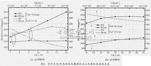 圖4 (b)為nLDMOS在漂移區注入劑量Nd=4e11cm-2時關態耐壓、開態耐壓與漂移區長度Ld(μm)的關係,以及在漂移區長度Ld=15μm情況下關態耐壓、開態耐壓與漂移區注入劑量Nd(cm-2)的關係。其他參數為:p型體區注入劑量5e13 cm-2,Psink注入劑量3e15 cm-2,N-buffer注入劑量1e13cm-2,溝道長度3μm,柵極場板3.5μm。相對於pLDMOS,漂移區注入劑量和漂移區長度對於開態耐壓、關態耐壓的影響不大。同時關態耐壓都能維持在180V以上,但是開態耐壓卻隻有90~120V,不能滿足8~100V工作電壓(108V耐壓)的要求。nLDMOS開態耐壓問題成為電路、器件設計的關鍵。