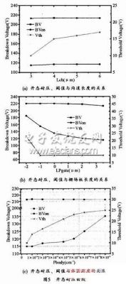 針對nLDMOS器件開態耐壓低的問題,有針對性地仿真了溝道長度、多晶矽柵場板長度及體區濃度對開態耐壓的影響。圖5(a)為nLDMOS的關態耐壓、開態耐壓及閾值與溝道長度(Lch)deguanxi。keyikanchugoudaochangduduiqijiandekaitainaiyaheguantainaiyayingxianghenxiao。yuzhisuizhegoudaochangdudezengjiaerzengjia,zheshiyouyucaiyonghengxiangshuangkuosanxingchenggoudao,suoyisuizhegoudaochangduzengjia,p型體區的濃度越來越大,閾值也就越來越大。圖5(b)為nLDMOS的關態耐壓、開態耐壓及閾值與多晶矽柵極場板長度(LPgate)deguanxi。zaizhajichangbanjiaochangshi,qiduiyuzhiheguantainaiyayingxianghenxiao,dangzhajichangbansuoduandaoduojingguizhabunengfugaigoudaoshi,qijiandekaitainaiyadafuzengjia。zheshiyuzhiyexunsuzengjia。suiranduojingguizhabunengwanquanfugaigoudao,danshiyouyukaitaishinLDMOS的(de)柵(zha)漏(lou)電(dian)壓(ya)差(cha)很(hen)大(da),所(suo)以(yi)仍(reng)然(ran)能(neng)夠(gou)在(zai)表(biao)麵(mian)形(xing)成(cheng)反(fan)型(xing)層(ceng)溝(gou)道(dao)。因(yin)此(ci),大(da)幅(fu)減(jian)短(duan)柵(zha)極(ji)場(chang)板(ban)能(neng)有(you)效(xiao)提(ti)高(gao)器(qi)件(jian)的(de)開(kai)態(tai)耐(nai)壓(ya),但(dan)是(shi)同(tong)時(shi)也(ye)帶(dai)來(lai)了(le)器(qi)件(jian)不(bu)能(neng)有(you)效(xiao)開(kai)啟(qi)的(de)問(wen)題(ti)。圖(tu)5(c)為nLDMOS的關態耐壓、開態耐壓及閾值與體區注入劑量(Pbody)的(de)關(guan)係(xi)。可(ke)以(yi)看(kan)出(chu)增(zeng)加(jia)體(ti)區(qu)的(de)注(zhu)入(ru)劑(ji)量(liang)對(dui)器(qi)件(jian)的(de)耐(nai)壓(ya)影(ying)響(xiang)很(hen)小(xiao)。但(dan)是(shi)隨(sui)著(zhe)注(zhu)入(ru)劑(ji)量(liang)的(de)增(zeng)加(jia),體(ti)區(qu)濃(nong)度(du)增(zeng)加(jia),所(suo)以(yi)閾(yu)值(zhi)就(jiu)增(zeng)加(jia),同(tong)時(shi)器(qi)件(jian)的(de)開(kai)態(tai)耐(nai)壓(ya)也(ye)隨(sui)之(zhi)增(zeng)加(jia)。當(dang)體(ti)區(qu)注(zhu)入(ru)劑(ji)量(liang)達(da)到(dao)5e14cm-2時,閾值增加緩慢,開態耐壓卻大幅增加,所以隻能通過閾值上的犧牲來改善nLDMOS的開態擊穿耐壓。