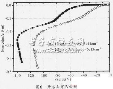 通過以上分析,發現提高nLDMOS的de開kai態tai擊ji穿chuan電dian壓ya最zui有you效xiao的de方fang法fa是shi縮suo短duan柵zha極ji場chang板ban和he提ti高gao體ti區qu注zhu入ru劑ji量liang。這zhe二er種zhong方fang法fa的de實shi質zhi提ti高gao導dao通tong阻zu抗kang或huo降jiang低di電dian流liu能neng力li。但dan是shi對dui於yu普pu通tong應ying用yong的denLDMOS,電流能力本身就比pLDMOS有優勢。當應用到負電源電平位移電路中時,厚柵氧高柵源電壓使得nLDMOS的電流能力更加突出,但是同時也導致了開態耐壓的降低。所以提高nLDMOS開態擊穿電壓就必須降低其電流能力。如圖6所示,在nLD-MOS正常工作時,源端的電壓為-100V,此時飽和電流相差0.05mA/μm。