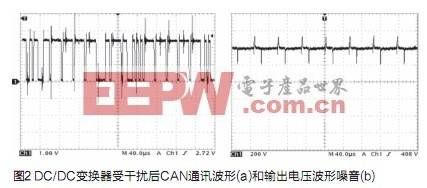 FCEV用DC/DC變換器的功率一般比較大,通常選擇IGBT為功率開關管。功率開關管IGBT工作過程中產生高的du/dt和di/dt以及浪湧電流和尖峰電壓[1],這是FCEV用大功率DC/DC變bian換huan器qi產chan生sheng電dian磁ci幹gan擾rao最zui根gen本ben的de原yuan因yin。另ling外wai功gong率lv開kai關guan管guan開kai通tong和he關guan斷duan瞬shun間jian,由you於yu分fen布bu電dian感gan和he分fen布bu電dian容rong的de存cun在zai,電dian感gan電dian流liu容rong易yi發fa生sheng高gao頻pin振zhen蕩dang,這zhe些xie因yin素su都dou會hui產chan生sheng強qiang大da的de電dian磁ci幹gan擾rao,這zhe在zaiFCEV用大功率DC/DC變換器中表現的尤為明顯。這種電磁幹擾嚴重影響整車控製器與CAN通信,導致CAN通訊頻繁報錯,無法正常通訊。CAN通訊受幹擾後的傳輸波形如圖2(a)所示。從圖中可以明顯看到,變換器開關噪音疊加在CAN通訊脈衝上,並且幅度很大。此外,嚴重的電磁幹擾也會使大功率DC/DC變換器輸出紋波過大,紋波過大直接影響大功率DC/DC變換器的性能[2]。圖2(b)是用示波器采集到的變換器未經濾波處理的輸出電壓波形,從圖中可以看到,輸出電壓上疊加了大量的開關噪音。