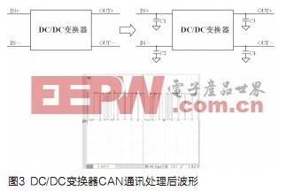 FCEV用大功率DC/DC變換器產生的電磁幹擾以傳導幹擾為主。目前最常用的方法就是在DC/DC變換器輸入和輸出端加裝濾波電容器。如圖3,為了減小FCEV用大功率DC/DC變換器對CAN通訊的幹擾,在變換器輸入輸出端加適量的接地電容,CAN通訊波形得到有效改善。