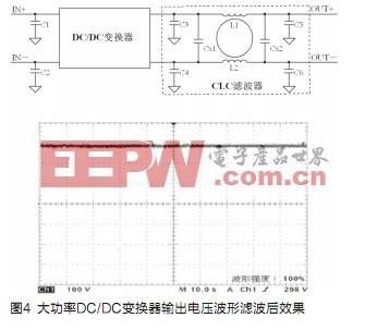 在FCEV用大功率DC/DC變換器中,輸出電壓或電流紋波是電源的重要指標。圖4在大功率DC/DC變換器的輸出端連接CLC濾波器後,變換器輸出電壓波形平穩,開關噪音減小,濾波效果十分明顯。