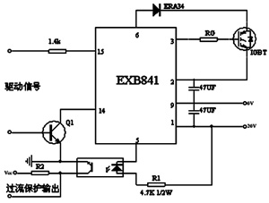 隨著IGBT在各類變流裝置中的廣泛應用,IGBT驅動模塊的選擇及其性能越來越引起使用者的重視。理想的驅動模塊除了應為IGBT提供足夠的開通和關斷柵壓外,還應具備迅速、可靠的保護功能,同時力求電路簡單、穩定。IGBT的常用驅動模塊有許多種,其中EXB係列應用最廣。EXB841驅動模塊廣泛應用於開關電源、UPS、電力傳動及電力補償等領域。圖4所示是本設的IGBT的驅動電路圖。