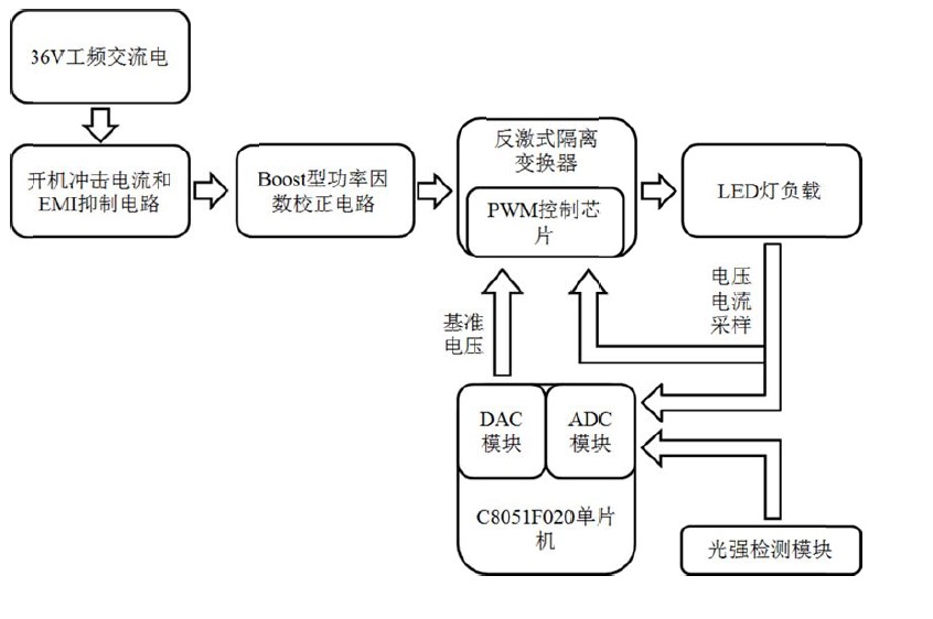 220VAC經工頻變壓器降壓為36VAC,經開機衝擊電流抑製電路輸入到功率因數校正電路中,再經高頻隔離變壓器給串聯在一起的LED燈供電,在LED燈處分別進行電壓、電流采樣,返回給PWM控製芯片和單片機,由單片機給定基準電壓來控製PWM控製芯片,進而達到控製LED燈恒流可調的目的。係統總體結構框圖如圖1所示。